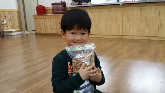 시운이가 직접 잘 볶아진 무말랭이를 식혀서 비닐팩에 넣어줘요
