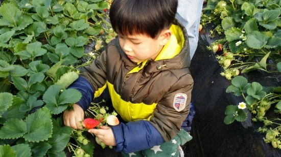 빨간 딸기를 시운이도 열심히 따고 있어요