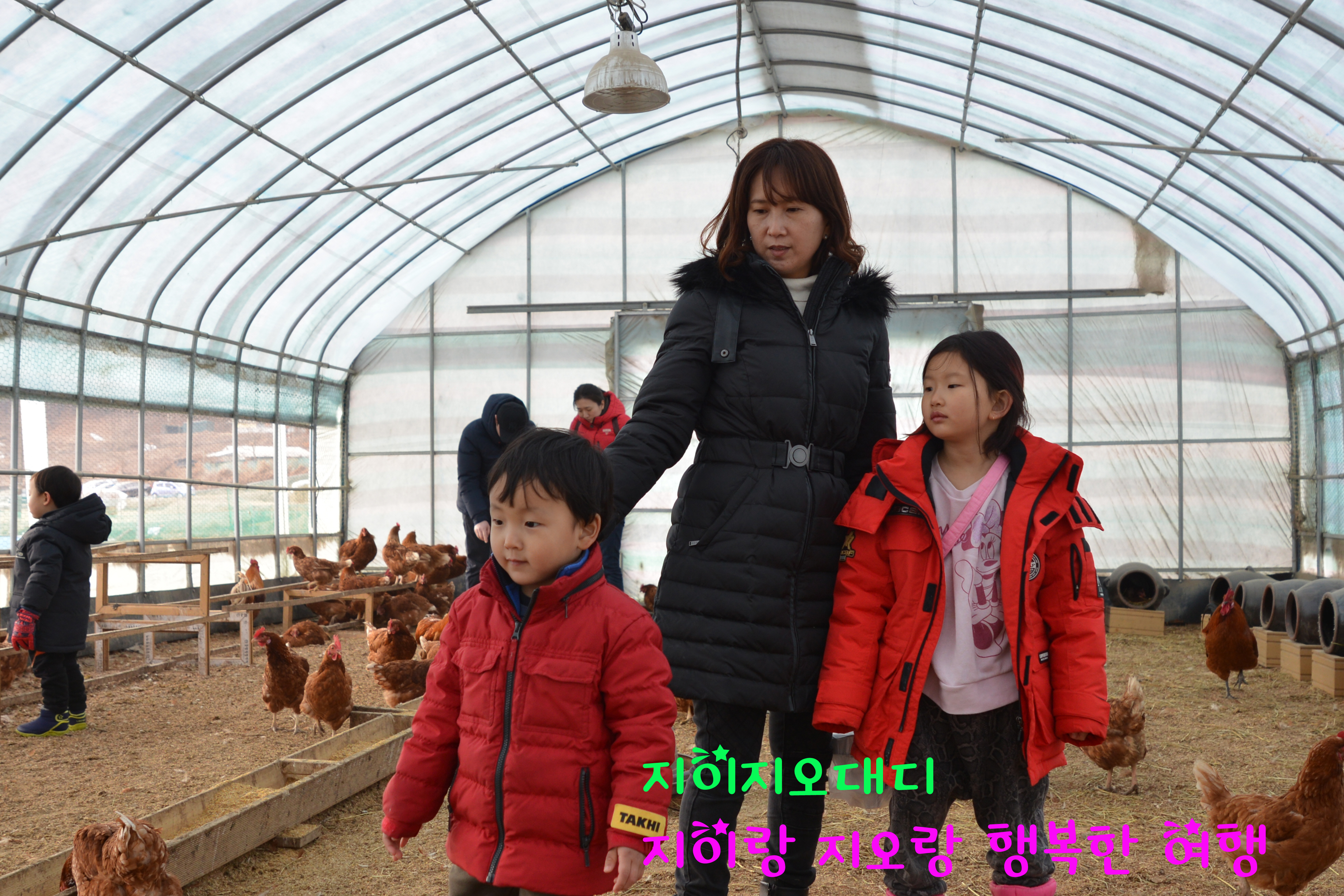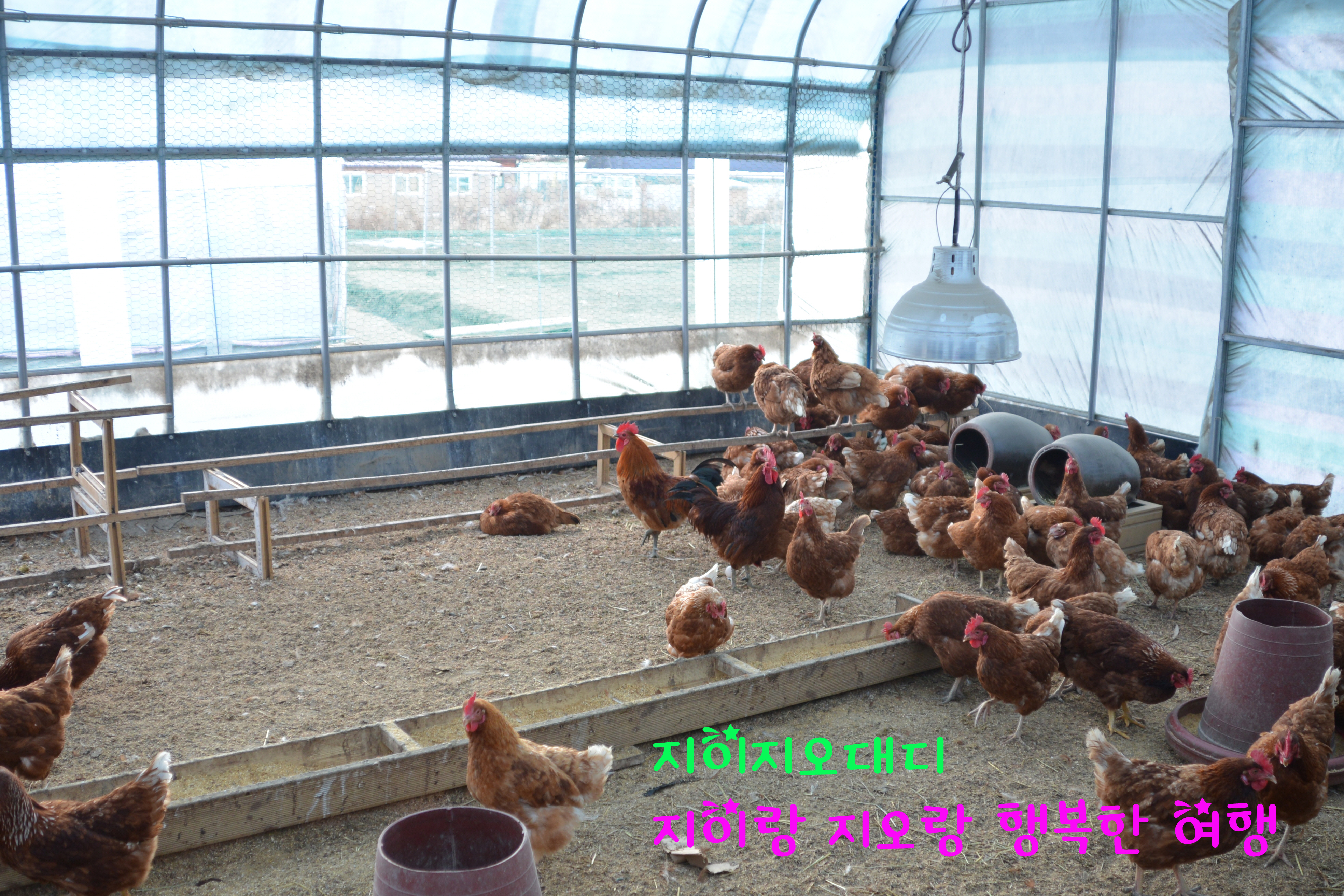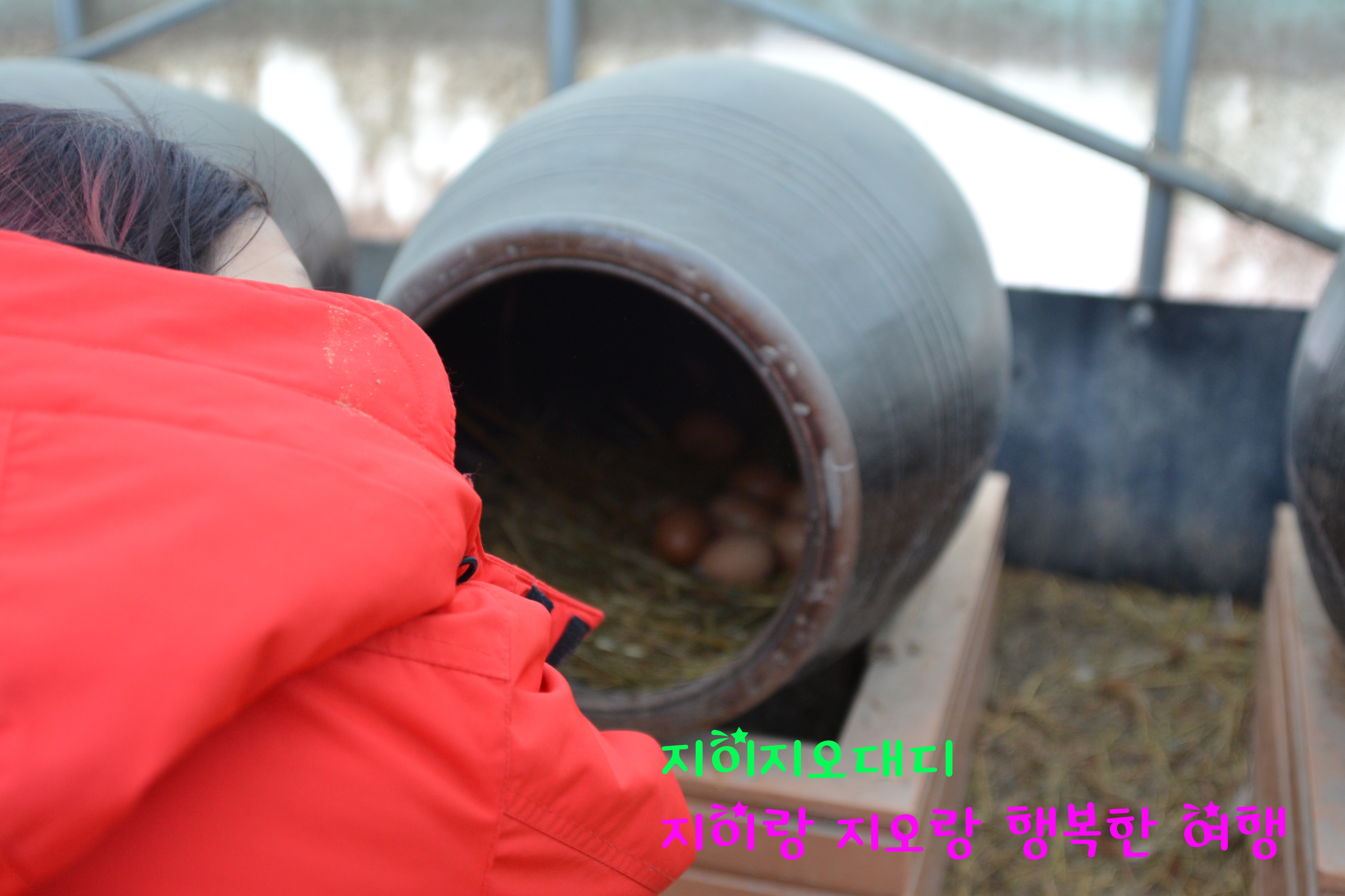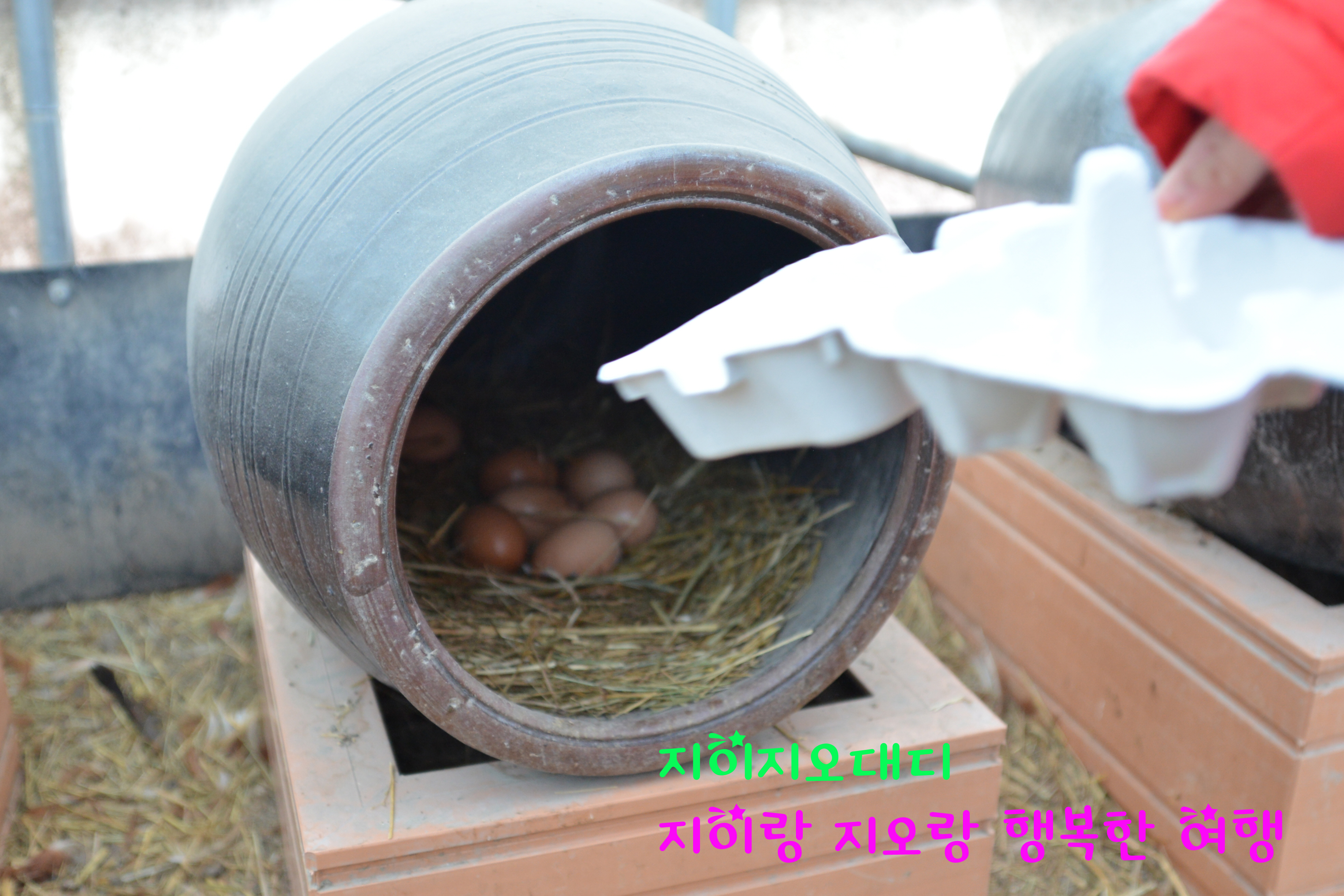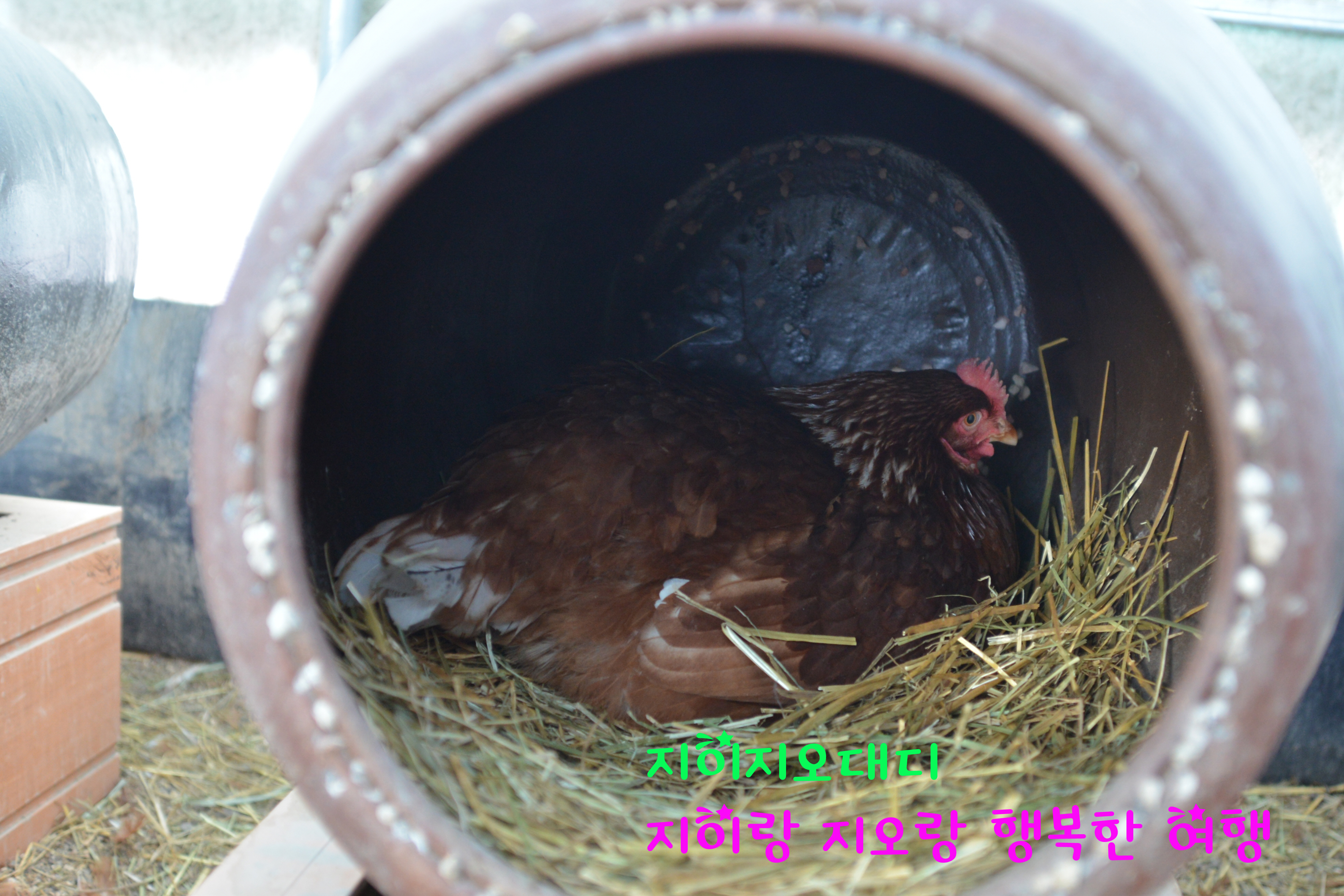 지이랑 지오는 닭이 알을 낳기를 기다리고 있습니다..