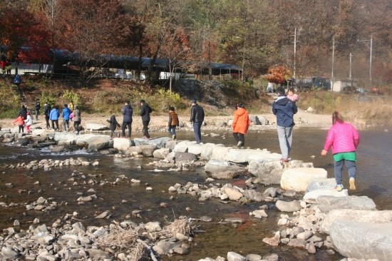 수미마을에 풍경과 넓은 개울가를 트렉터를 타고 지나갑니다