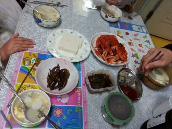 모두 샤워하고 간단하게 떡국을 끊여서 ,두부와 우리가 만든 김치와 굴을 사서