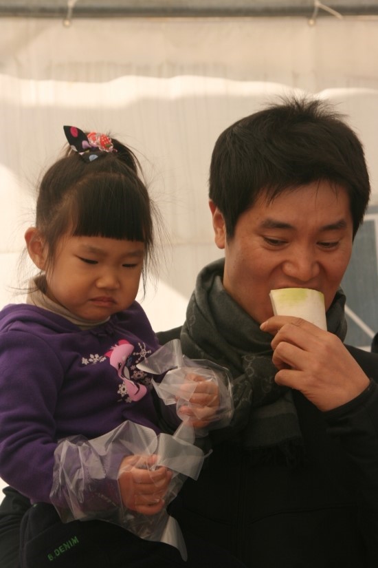 언니가 열심희 일하는 동안 려원이는 무를 잘도 먹네요