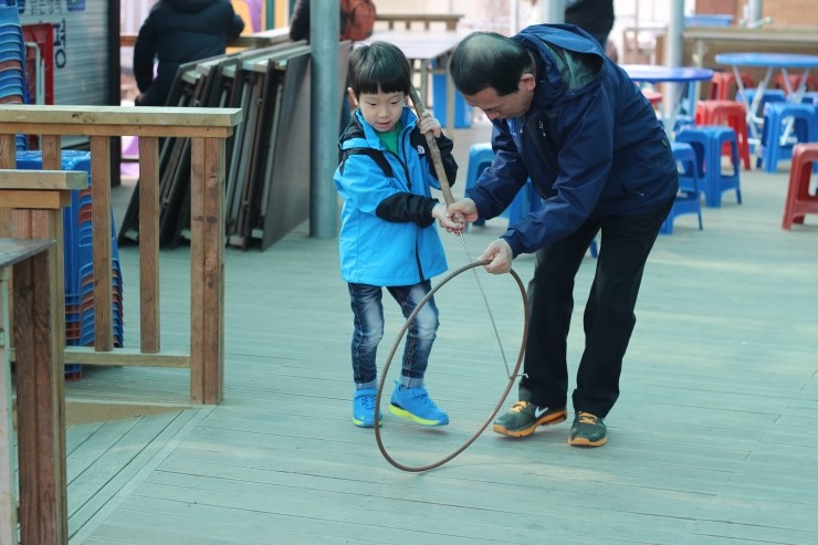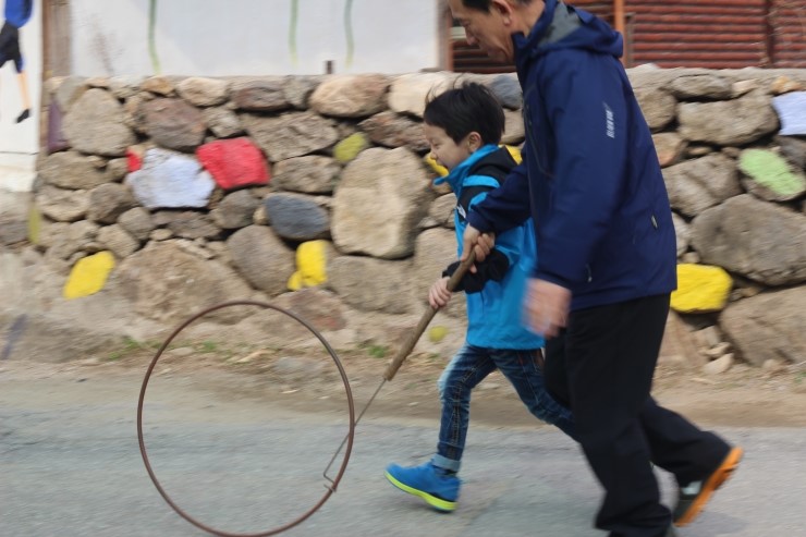 그러다 다시 밖에 나와 이번에는 굴렁쇠 굴리기를 했어요.